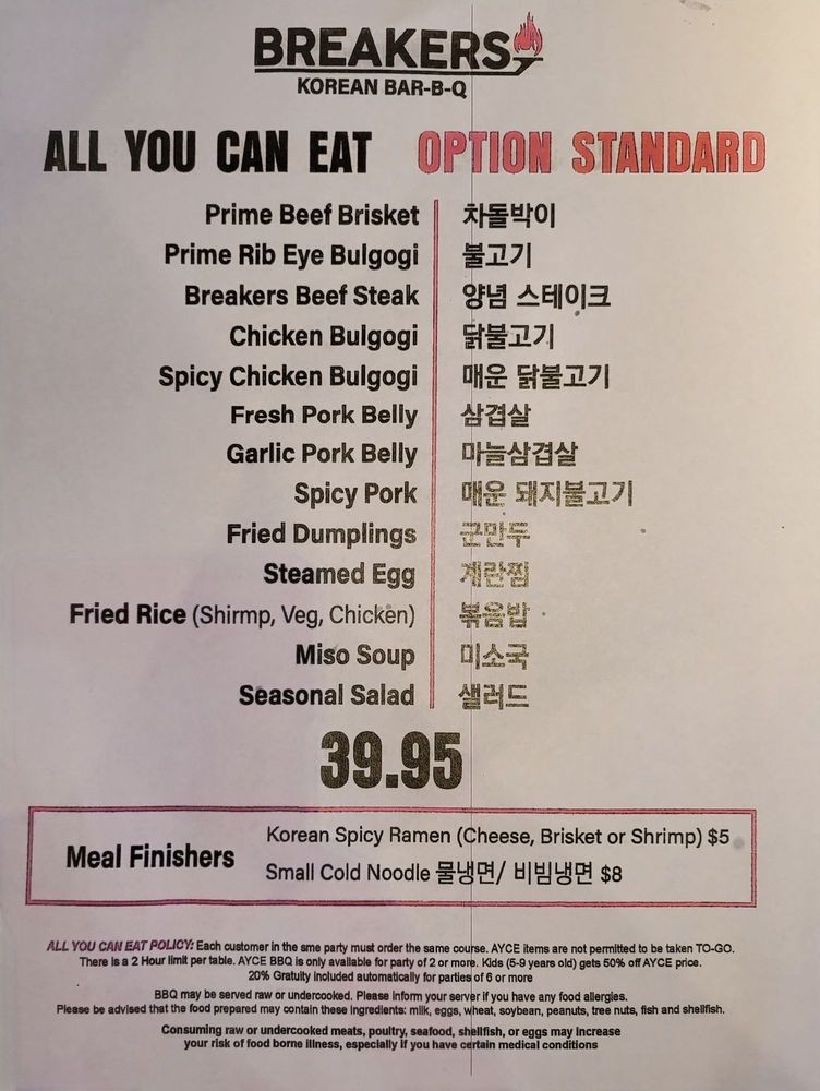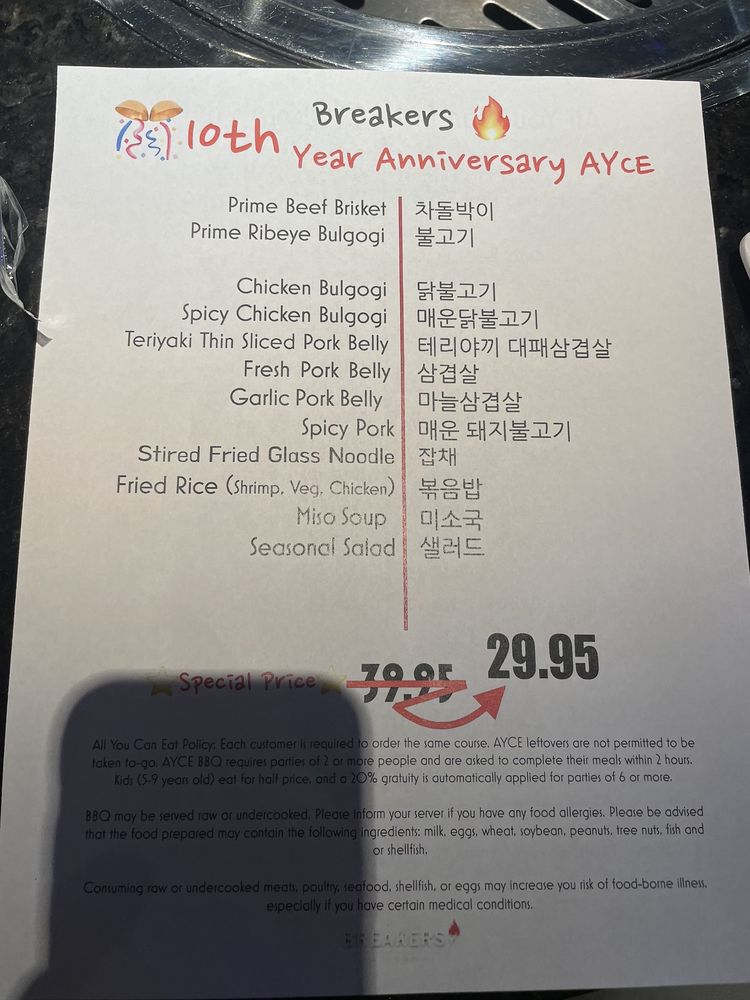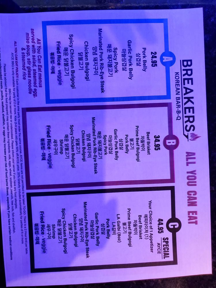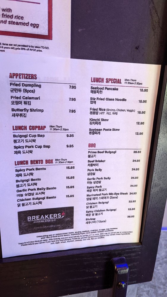 Breakers is a trendy and casual restaurant located in Fairfax, VA, offering a mix of Korean BBQ and barbeque options. The restaurant provides a wide range of amenities such as delivery, takeout, catering, and even drive-thru service. Customers praise the galbi and spicy pork dishes, highlighting the authenticity and flavor. The AYCE Korean BBQ option is popular, with customers raving about the various side dishes and juicy meat selections like beef brisket and pork belly. The friendly service and spacious, modern atmosphere add to the dining experience. Overall, Breakers is a great spot for groups, families, or a fun night out, offering a diverse menu and fantastic service. With positive reviews emphasizing the delicious food and exceptional service, Breakers stands out as a must-try dining destination in Fairfax.